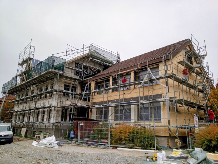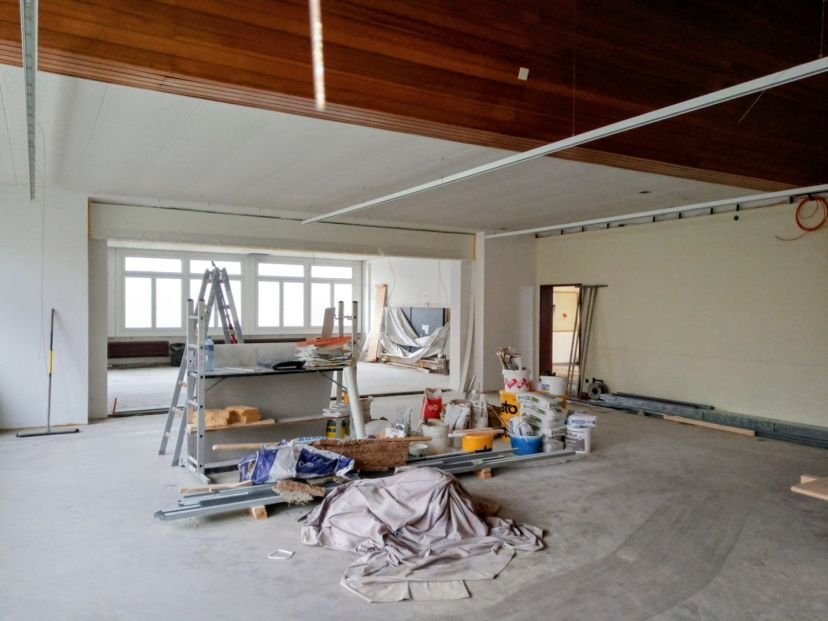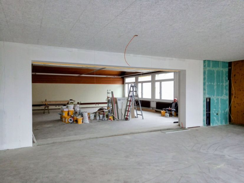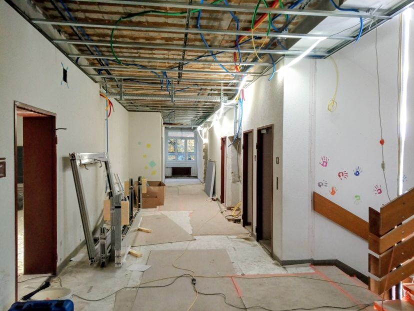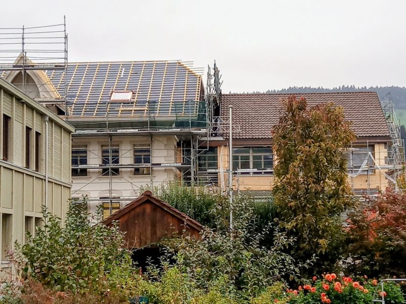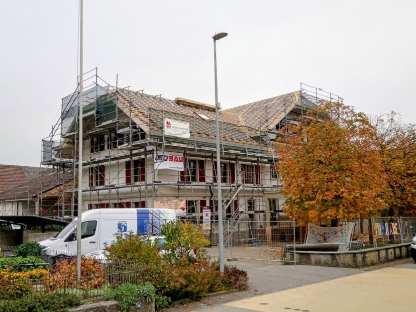 Seit dem Sommer laufen die umfangreichen Sanierungsarbeiten im leeren Schulhaus Bestand; Maler- und Gipserarbeiten, Erneuerung der Sanitär- und Elektroinstallationen, Dachsanierung, Schreinereiarbeiten, etc.