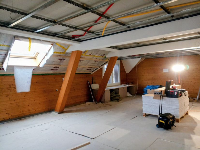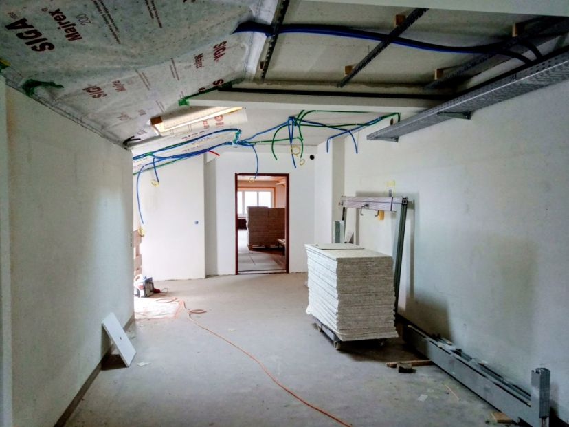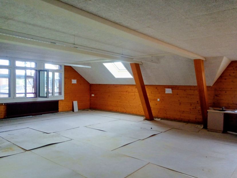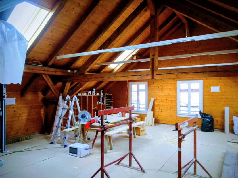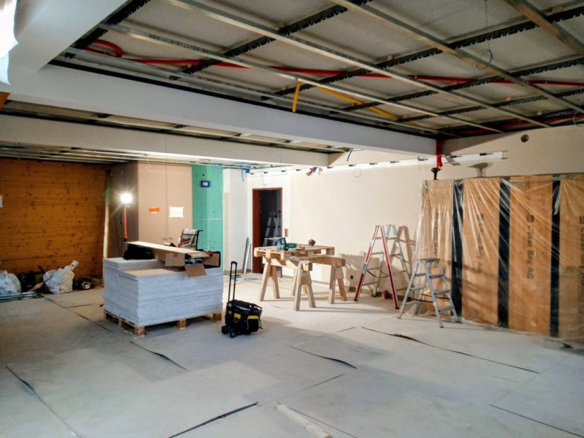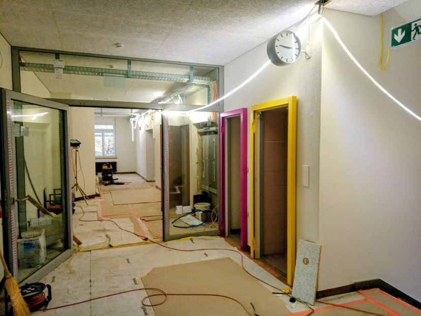 Seit dem Sommer laufen die umfangreichen Sanierungsarbeiten im leeren Schulhaus Bestand; Maler- und Gipserarbeiten, Erneuerung der Sanitär- und Elektroinstallationen, Dachsanierung, Schreinereiarbeiten, etc.