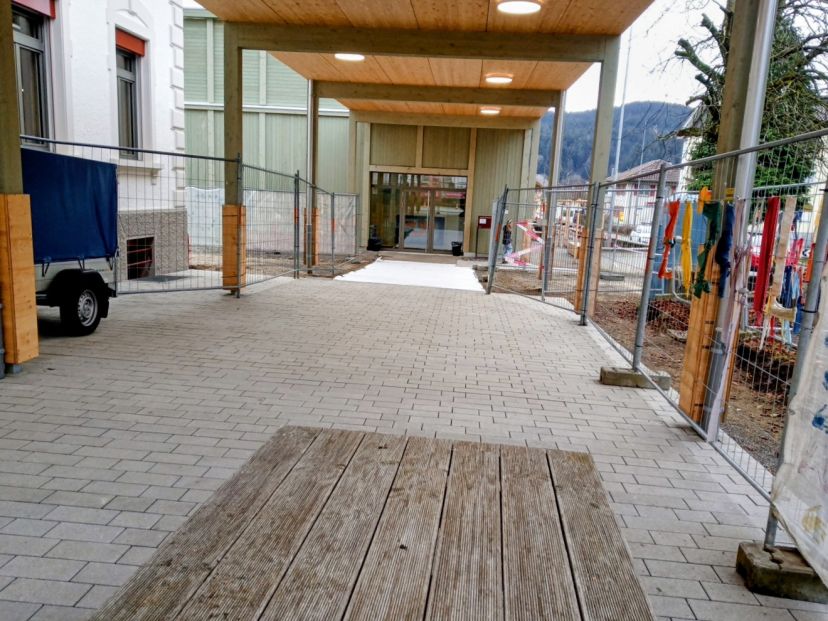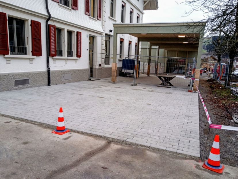 Die Umgebungsarbeiten wurden teilweise in den Sommerferien ausgeführt und werden bis im Frühling 2026 abgeschlossen. Im Juli wurden diverse weitere Massnahmen ausgeführt (Erneuerung der bestehenden Stützmauer entlang der Bahnhofstrasse, Inlinersanierung der Abwasserleitungen, Abbruch des Pavillons und Erstellung einer neuen Trafostation durch die BKW auf Seite Doktorgässli).